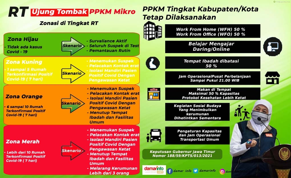 Dalam Keputusanya Gubernur Jawa Timur Khofifah Indar Parawansa memutuskan untuk melaksanakan PPKM Mikro sampai ke tingkat RT/RW, untuk seluruh Kabupaten/Kota di Jawa Timur.