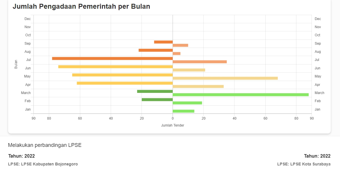 Berbeda dengan Kota Surabaya yang selalu melaksanakan tender lebih awal, pada tahun 2022 pada Bulan Januari sudah melaksanakan tender untuk 14 Pekerjaan, pada Bulan Februari melaksanakan 19 pekerjaan. Pelaksanaan tender terbanyak dilaksanakan pada Bulan Maret yakni sebanyak 88 pekerjaan.