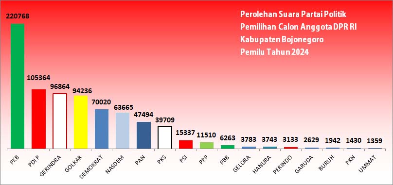 Dari hasil pileg 2024 lalu untuk calon anggota DPR RI, di Kabupaten Bojonegoro PKB mendapatkan suara sebanyak 220.768 suara dan PDI P mendapatkan 105.364 sehingga totalnya adalah 326.132 suara atau 41 persen dari total suara sah yakni 789.249 suara. Dan kedua partai ini memenangkan Pileg DPR RI di 28 Kecamatan di Bojonegoro, PKB memenangkan di 26 Kecamatan, dan PDI P memenangkan di dua kecamatan.