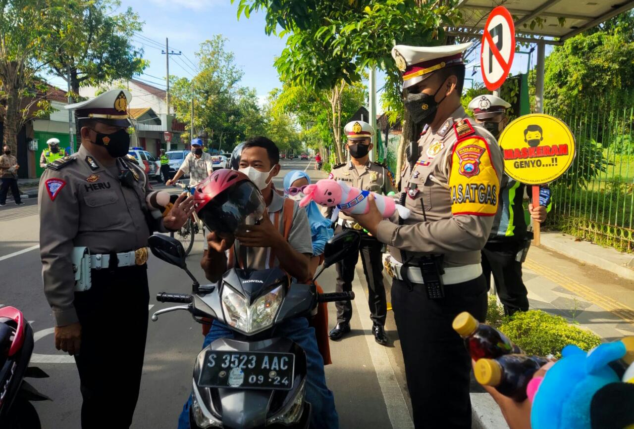 Bagi pengendara yang melintas dengan mematuhi protokol kesehatan (Prokes) dengan menggunakan masker dan dinyatakan tertib berlalu lintas. Juga membawa kelengkapan surat mendapatkan reward atau hadiah.