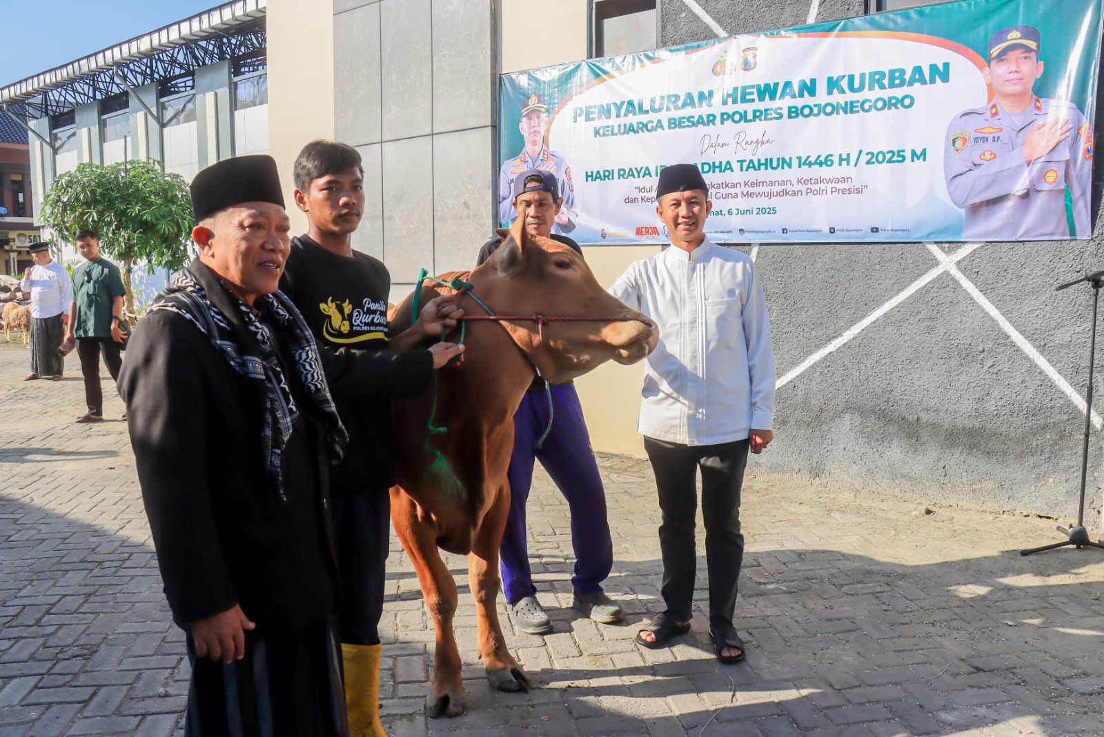 Penyaluran hewan kurban tersebut diawali dengan penyerahan secara simbolis oleh Kapolres Bojonegoro, AKBP Mario Prahatinto, kepada para perwakilan penerima. Penyerahan dilangsungkan di halaman GOR Polres Bojonegoro usai pelaksanaan Salat Idul Adha,yang turut dihadiri Wakapolres, para PJU, anggota dan Bhayangkari. Jumat 6-Juni-2025