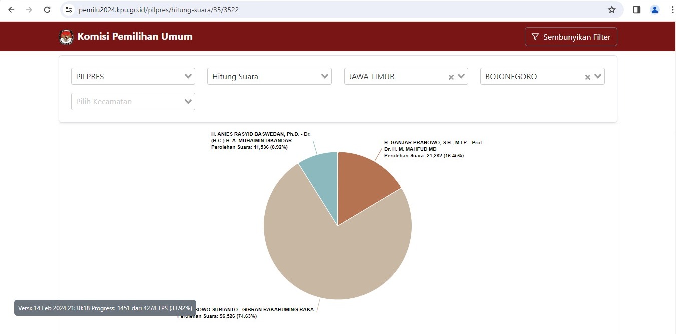 Melihat hasil dari Sistem Informasi Rekapitulasi Pemilu (Si Rekap) Komisi Pemilihan Umum (KPU) yang ditampilkan melalui website pemilu2024.kpu.go.id (diakses pada hari Rabu 14-2-2024, pukul 22.50 WIB), di Bojonegoro Pasangan Calon Presiden dan Wakil Presiden Prabowo Subiyanto – Gibran Rakabuming Raka unggul dari pasangan Anis Baswedan-Muhaimin Iskandar dan Ganjar Pranowo- Mahfud MD.
