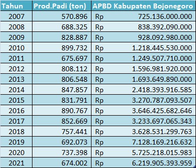 Berikut data produksi padi tahun 2007 -2021 yang bersumber dari data Badan Pusat Statistik (BPS) Jawa Timur dan data APBD tahun 2007 – 2021 yang bersumber dari data Dirjen Perimbangan Keuangan Kementerian Keuangan Republik Indonesia