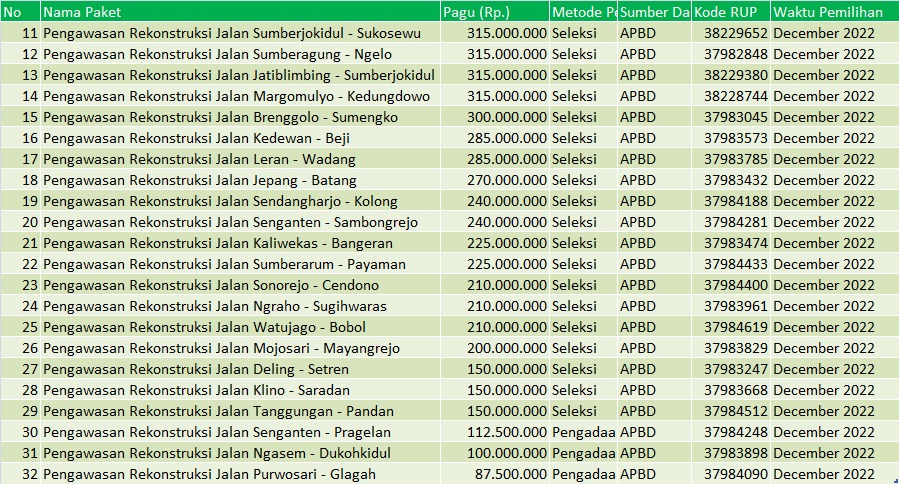 Proyek Pembangunan Jalan masih Menjadi Prioritas Pemkab Bojonegoro di Tahun 2023. 17 Desember 202217 Desember 2022oleh Redaksi 364 Dilihatoleh Redaksi (dok: pembangunan Jalan Poros Sugihwaras-Balen, tepatnya di depan Pasar Sugihwaras. Foto/Syafik) (Tabel Rencana Umum Pengadaan Dinas PU Bina Marga dan Penataan Ruang Kabupaten Bojonegoro tahun 2023. Sumber : Sirup lkpp) Penuliis : Syafik Laman sebelumnya Halaman: 1 2Baca Juga : Tahun 2021 Bojonegoro Bangun Jalan Cor Sepanjang 190 Km Berita TerkaitImmoderma Pionirkan Kecantikan Holistik lewat Kampanye “Cantik dari Hati” di BojonegoroGema Hari Jadi Bojonegoro ke-348: Momen Refleksi dan Kolektivitas Menuju Bojonegoro yang Bersinergi untuk MandiriKetua DPRD Bojonegoro Ikuti Prosesi Penyemayaman Api AbadiProsesi Sakral Pengambilan Api Abadi Kayangan Api Warnai HJB ke-348HJB 348 Tanpa Grebeg Berkah, Warga Gelar Tasyakuran di Desa Masing-masing