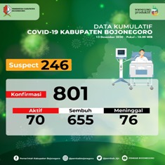 Jika ditotal warga yang positif terkonfirmasi sebanyak 801 orang. Dengan rincian aktif dalam perawatan 70 orang, sembuh 655 orang dan meninggal dunia 76 orang di Bojonegoro. Kemudian untuk kasus suspect sebanyak 246 orang.