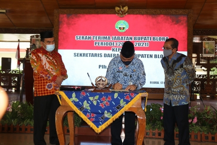 Blora-Sekretaris Daerah (Sekda) Kabupaten Blora, Komang Gede Irawadi menerima secara resmi estafet kepemimpinan sebagai Pelaksana Harian (Plh) Bupati Blora dari Bupati Blora periode 2016-2021, Djoko Nugroho, Rabu 17-Februari-2021.
