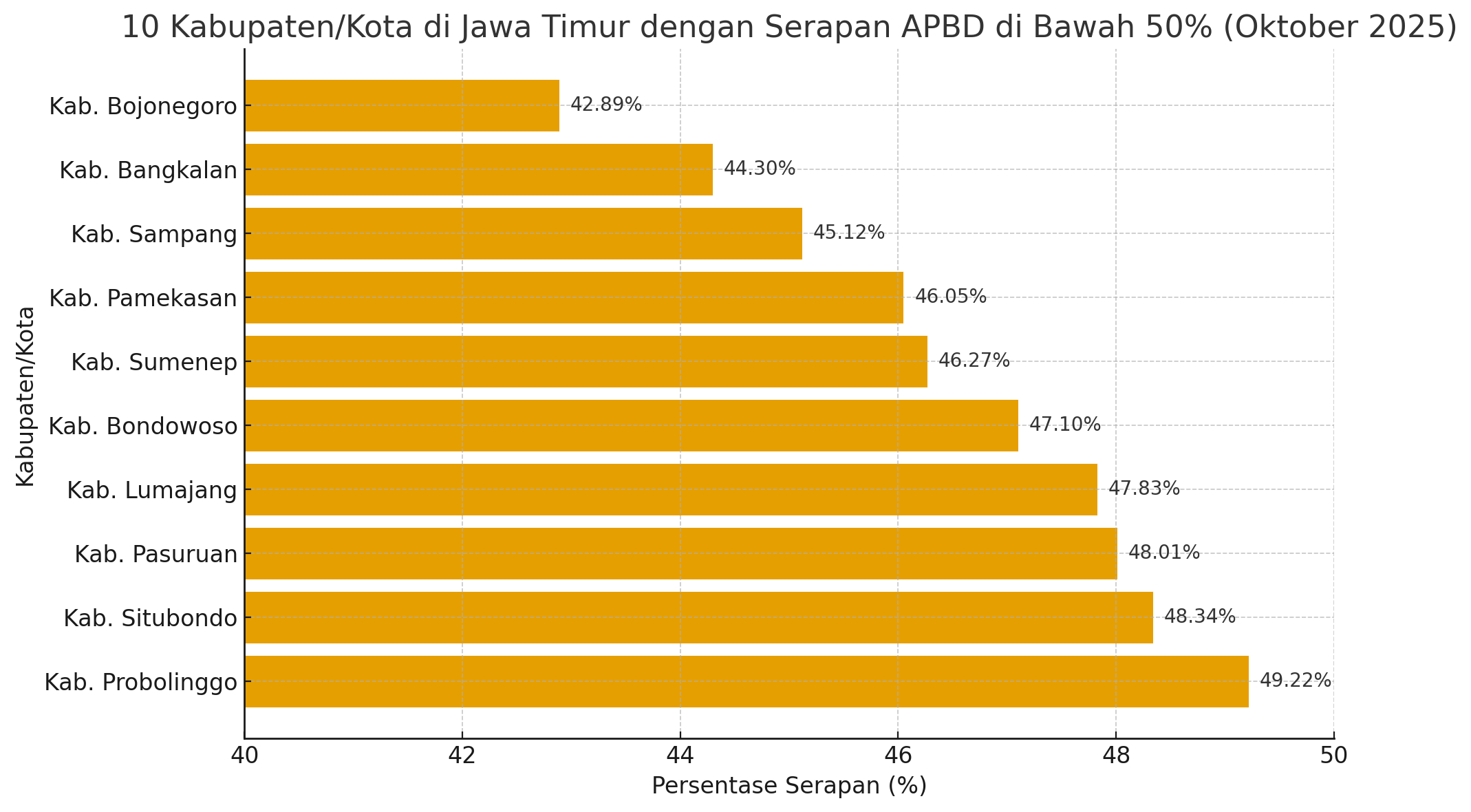Rendahnya realisasi anggaran ternyata juga meluas di Jawa Timur. Berdasarkan data Kementerian Dalam Negeri per Oktober 2025, ada sepuluh kabupaten/kota yang serapannya belum mencapai 50 persen.