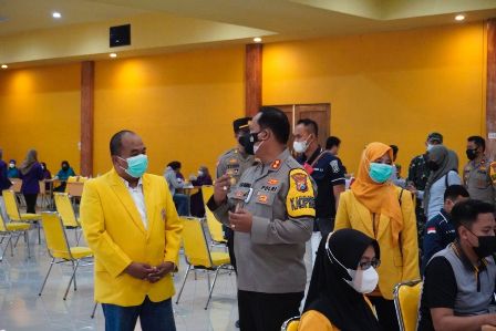 Polres Bojonegoro – Kepala Kepolisian (Kapolres) Bojonegoro AKBP E.G Pandia mengecek pelaksanaan vaksinasi serentak Perguruan Tinggi di Gedung Hall Suyitno Universitas Bojonegoro, Jumat 10-September-2021. “Hari ini kita melaksanakan vaksinasi serentak untuk Perguruan Tinggi,” terang Pandia.