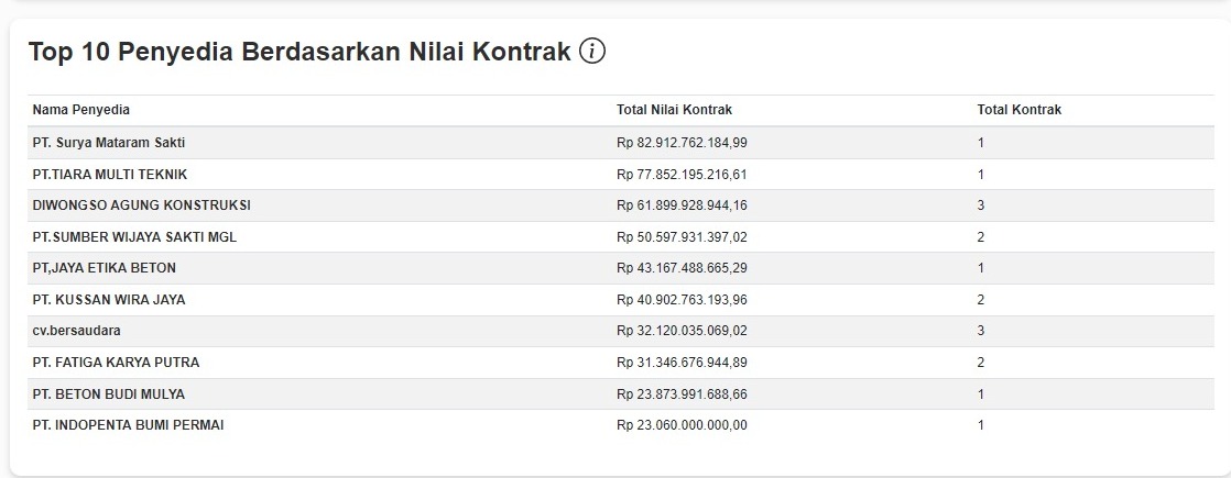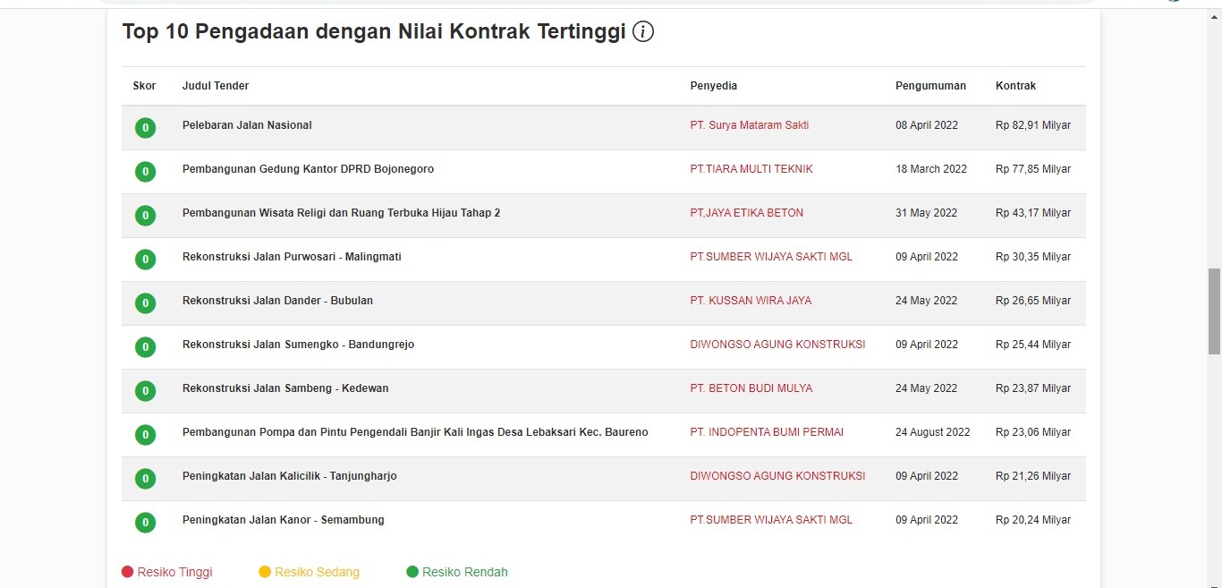 Dari data di atas terlihat bahwa 10 proyek dengan nilai tertinggi di Bojonegoro dikerjakan oleh Kontraktor yang bukan dari Kabupaten Bojonegoro.