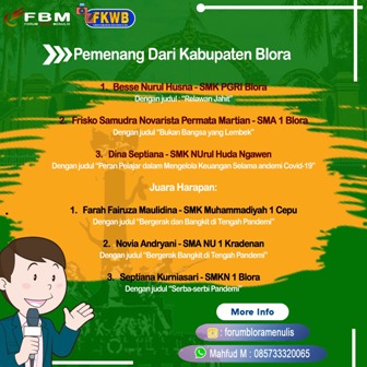Blora- Pelajar dari SMK PGRI Blora Besse Nurul Husna meraih juara pertama Kompetisi Menulis Pelajar 2021. Karya tulisnya berjudul “Relawan Jahit”. Terbaik kedua untuk kategori pelajar Kabupaten Blora diraih Frisko Samudra Novarista Permata Martian dari SMAN 1 Blora dengan judul “Bukan Bangsa yang Lembek”. Sementara, terbaik ketiga diraih Dina Septiana dari SMK Nurul Huda, Ngawen dengan judul karya “Peran Pelajar dalam Mengelola Keuangan Selama Pandemi Covid-19”.