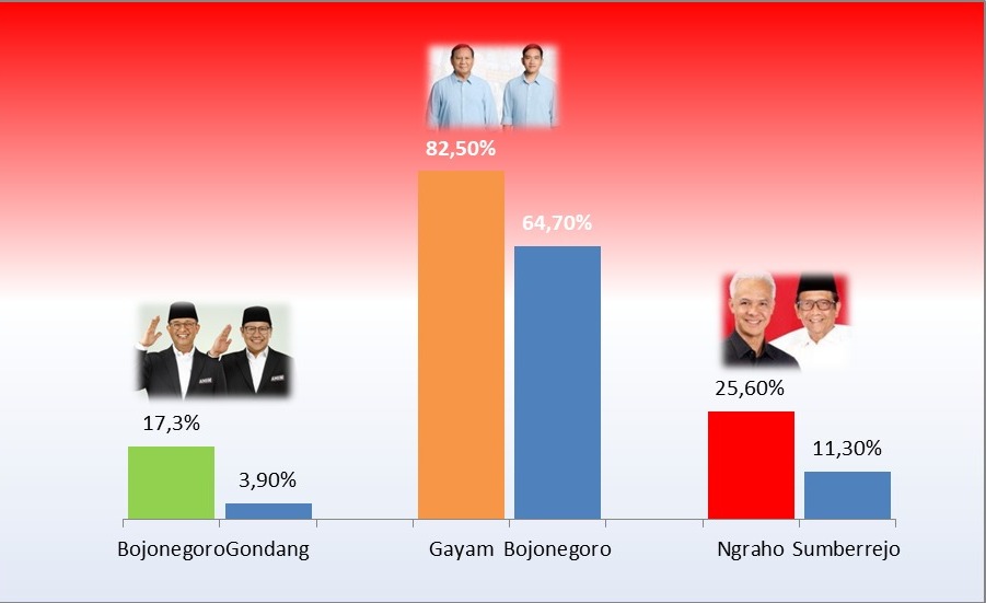 Untuk persentase perolehan suara pasangan Prabowo-Gibaran tertinggi di Kecamatan Gayam dengan persentase sebesar 82,5 persen dan terendah di Kecamatan Bojonegoro dengan persentase sebesar 64,7 persen.