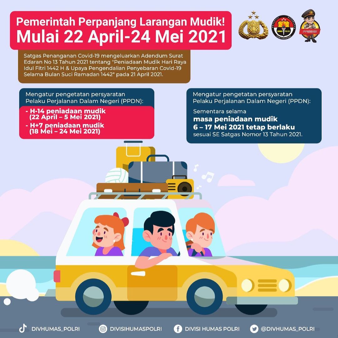 Untuk peniadaan mudik ini, pemerintah melalui Satuan Tugas Covid-19, mengeluarkan Surat Edaran Nomor 13 Tahun 2021. Pada surat ini pemerintah melarang perjalanan mudik terhitung mulai 6 –17 Mei 2021. Lalu pada tanggal 21 April 2021 ada tambahan (adendum) pada surat yang sama, dengan istilah pengetatan mobilitas pelaku perjalanan dalam negeri menjelang masa peniadaan mudik yang dimulai tanggal 22 April 2021. Pada masa ini masyarakat masih diperkenankan untuk melakukan perjalanan tetapi dengan persyaratan yang ketat, utamanya tentang hasil uji covid-19, baik itu PCR, Antigen, G-Nose dan uji lain yang ditentukan oleh pemerintah.
