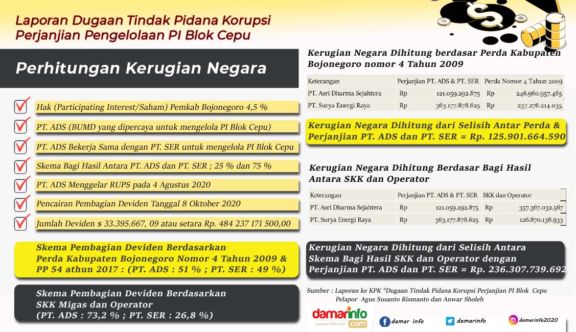 Tindakan para bupati tersebut diyakini oleh Gus Ris dan Anwar Sholeh yang menyebabkan terjadinya kerugian negara akibat skema pembagian dividen atau keuntungan dari pengelolaan PI Blok Cepu. Besaran kerugian negara pasca Rapat Umum Pemegang Saham (RUPS) tanggal 4 Agustus 2020 sebesar Rp. $ 8 682 873, 45, setara Rp. 125 901 665 000,00 (Seratus dua puluh lima miliar sembilan ratus satu juta enam ratus enam puluh lima ribu rupiah) jika di hitung dengan menggunakan ketentuan dalam Peraturan Daerah Kabupaten Bojonegoro Nomor 4 tahun 2009 Pasal 39 ayat (1) yang mana sekurang-kurangnya 51% saham dan keuntungan menjadi Hak BUMD.