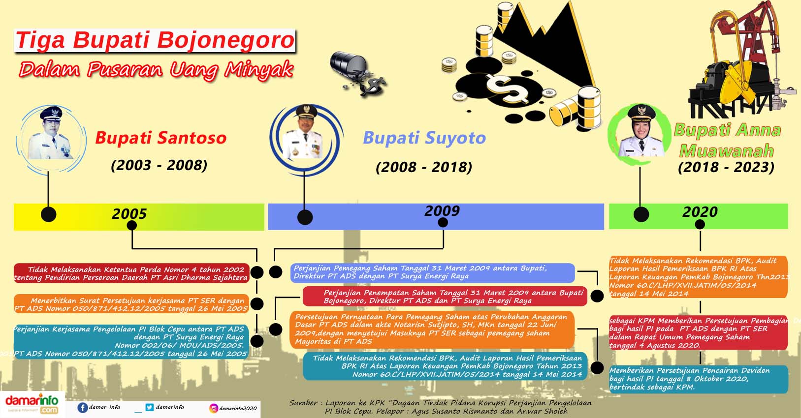Ya, pekan ini ada muncul laporan dari Agus Susanto Rismanto dan Anwar Sholeh (keduanya mantan anggota DPRD Bojonegoro) datang ke Komisi Pemberantasan Korupsi (KPK) RI di Jakarta, yang mengungkap banyak hal tentang Perjanjian Pengelolaan Participating Interest (PI) Blok Cepu. Salah satunya terkait keterlibatan para Bupati Bojonegoro sejak tahun 2005, saat awal perjalanan perjanjian ini.