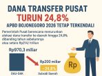 Bojonegoro,damarinfo.com – Pemerintah Pusat berencana menurunkan alokasi dana transfer ke daerah hingga 24,8% dibanding tahun sebelumnya. Angka tersebut setara dengan Rp214,1 triliun.