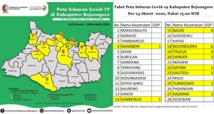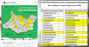 Bojonegoro-Bupati Bojonegoro Anna Muawanah melalui akun instagramnya Anna_muan32 membagikan infografis Peta Sebaran Covid-19 di Kabupaten Bojonegoro per 22-Maret-2020, Pukul 12.00. Dalam infografis