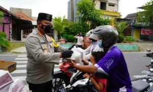 Damarinfo-Bojonegoro – Kepala Kepolisian Resor Bojonegoro, AKBP EG Pandia bersama anggota, bagi-bagi takjil di depan Mapolres Bojonegoro, Jalan MH. Thamrin, Selasa 13-April-2021.