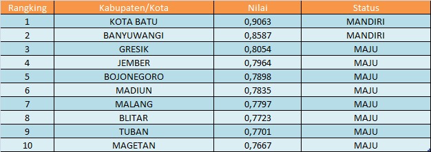 Berikut rata-rata nilai IDM Kabupaten/Kota di Jawa Timur dengan dimulai dengan nilai IDM tertinggi tahun 2022;