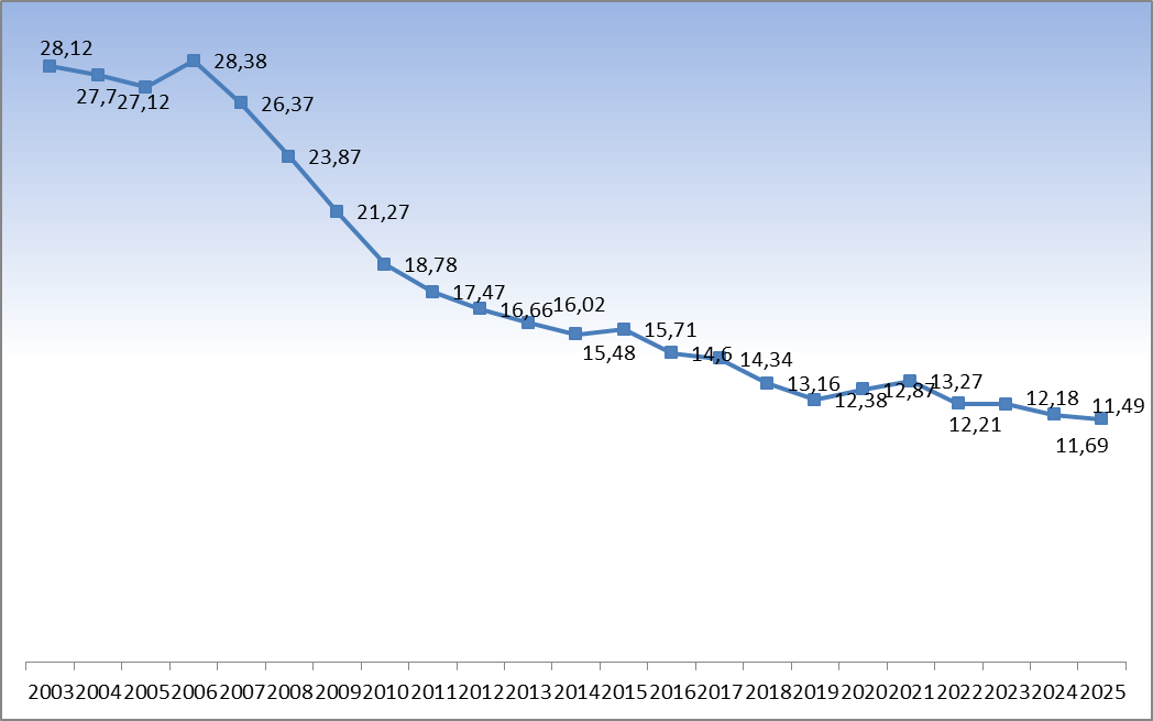 Lebih jauh lagi, tren terbaru justru makin pelan. Dari 2022 ke 2025, angka kemiskinan turun dari 12,21% menjadi 11,49%. Artinya, rata-rata penurunan hanya 0,24 poin per tahun. Jika tren ini berlanjut, target 8,98% baru bisa tercapai pada 2034–2035, bukan di 2026.